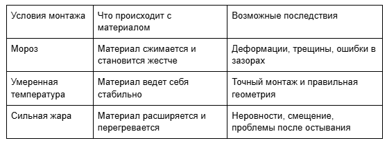 Материалы для террасы, особенно древесина и древесно-полимерный композит, реагируют на температуру и влажность. Они расширяются и сжимаются, то есть буквально “дышат”. Если монтировать покрытие в мороз, материал становится более жестким, а размеры могут отличаться от тех, которые будут в теплую погоду. Из-за этого позже появляются перекосы, щели или лишнее напряжение в крепеже. Сильная жара тоже не лучший вариант: доска нагревается, меняет геометрию уже во время монтажа, и после остывания конструкция может повести себя не так, как ожидалось.